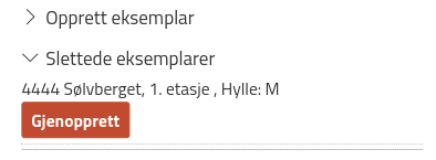 Slettede eksemplarer kan gjenopprettes inntil 6 måneder etter sletting. Under Opprett eksemplar ligger Slettede eksemplar hvis det er slettede eksemplar knyttet til posten. Trykk på knappen , tidligere eksemplarlogg er tatt vare på og blir tilgjengelig igjen.