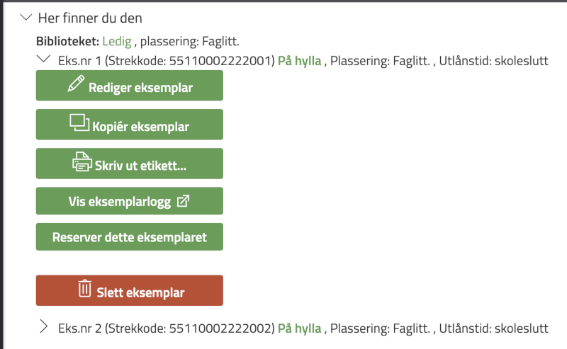 Sletting av enkelteksemplar, ligger på eksemplaret (Her finner du den), bruk knappen :