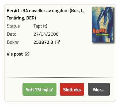 I Masseendring ligger knappen som kasserer/sletter eksemplaret. Hvis denne knappen ikke vises så skyldes det at den som standard er skrudd av. De to innstillingene som er aktuelle må skrus på av superbruker eller leverandøren. [3]